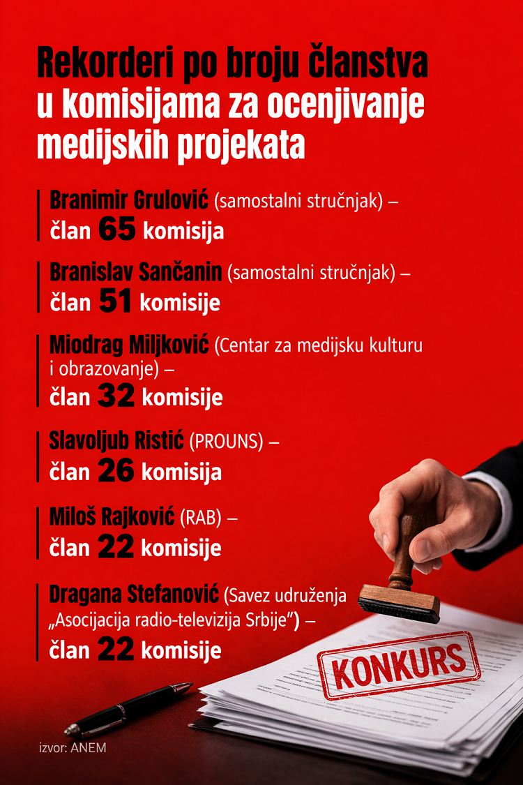 The system of project co-financing for media content, which is intended to ensure media pluralism and the production of content in the public interest, has, in practice, become one of the most controversial mechanisms for distributing public funds in Serbia over the past few years. Instead of supporting professional journalism, numerous competitions increasingly end up as a model of political allocation of funds, where the fate of hundreds of millions of dinars is decided by a small group of people who appear year after year in dozens of competition committees across the country.