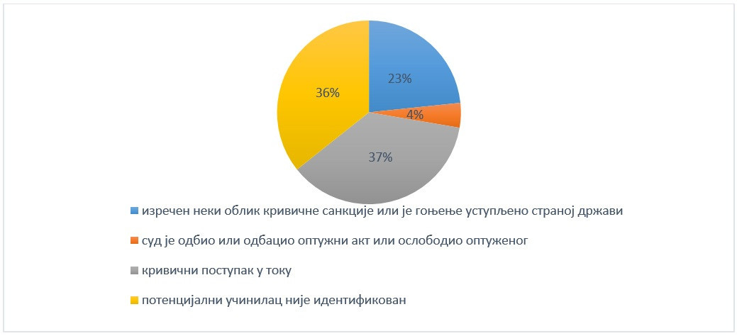 - u 102 predmeta (23,34%) je do sada izrečen neki oblik krivične sankcije ili je gonjenje ustupljeno stranoj državi;