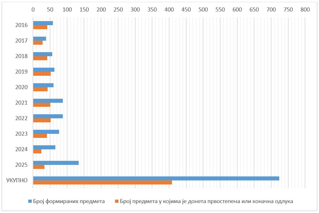 Prvostepena ili konačna odluka doneta je u 51 predmetu, što predstavlja 58,62% ukupnog broja predmeta.